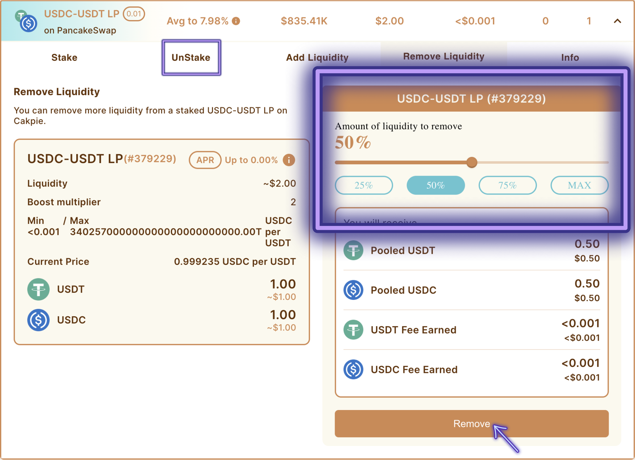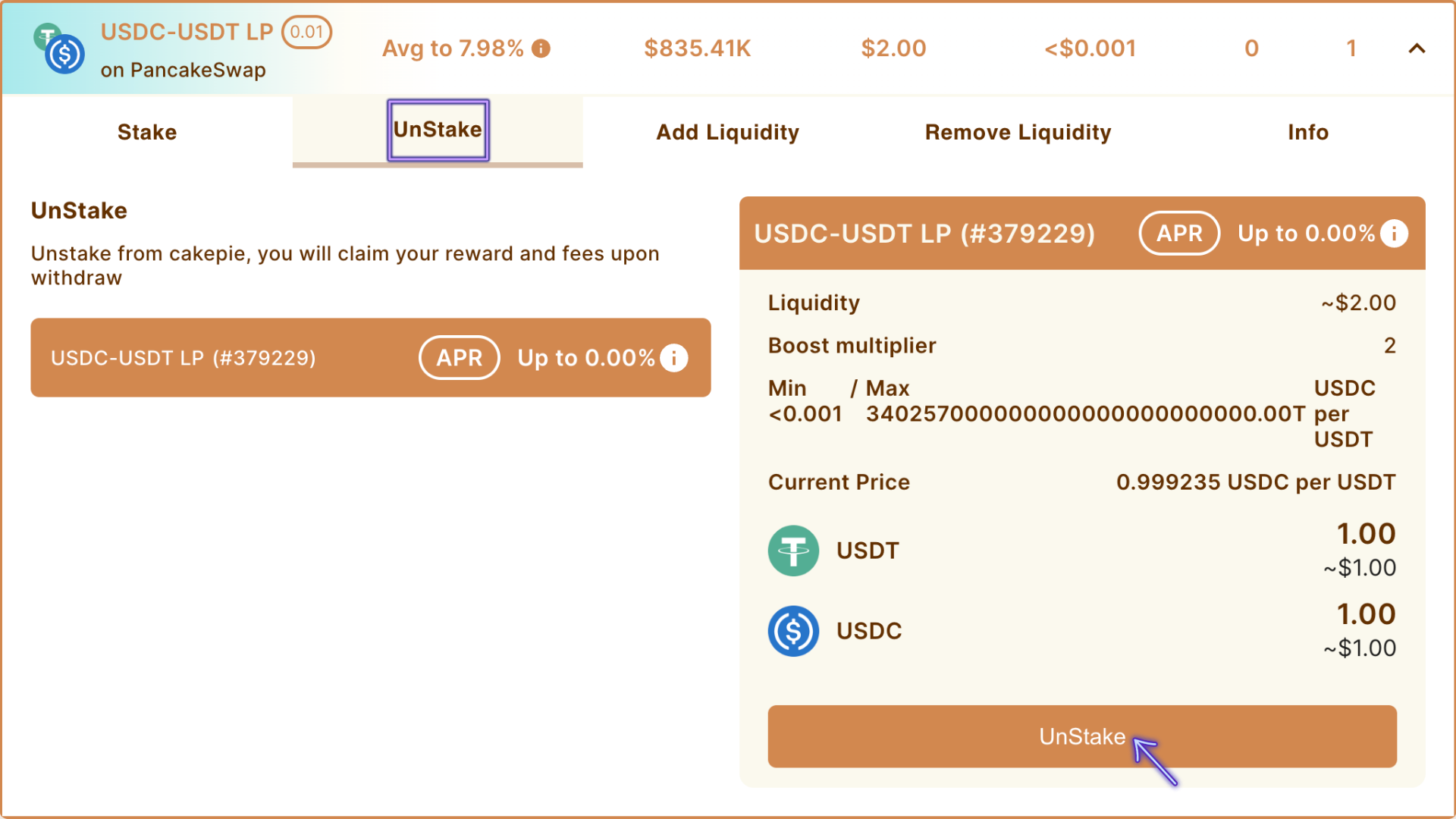 ## 8. Usuários podem selecionar para desfazer o stake de sua liquidez da Cakepie