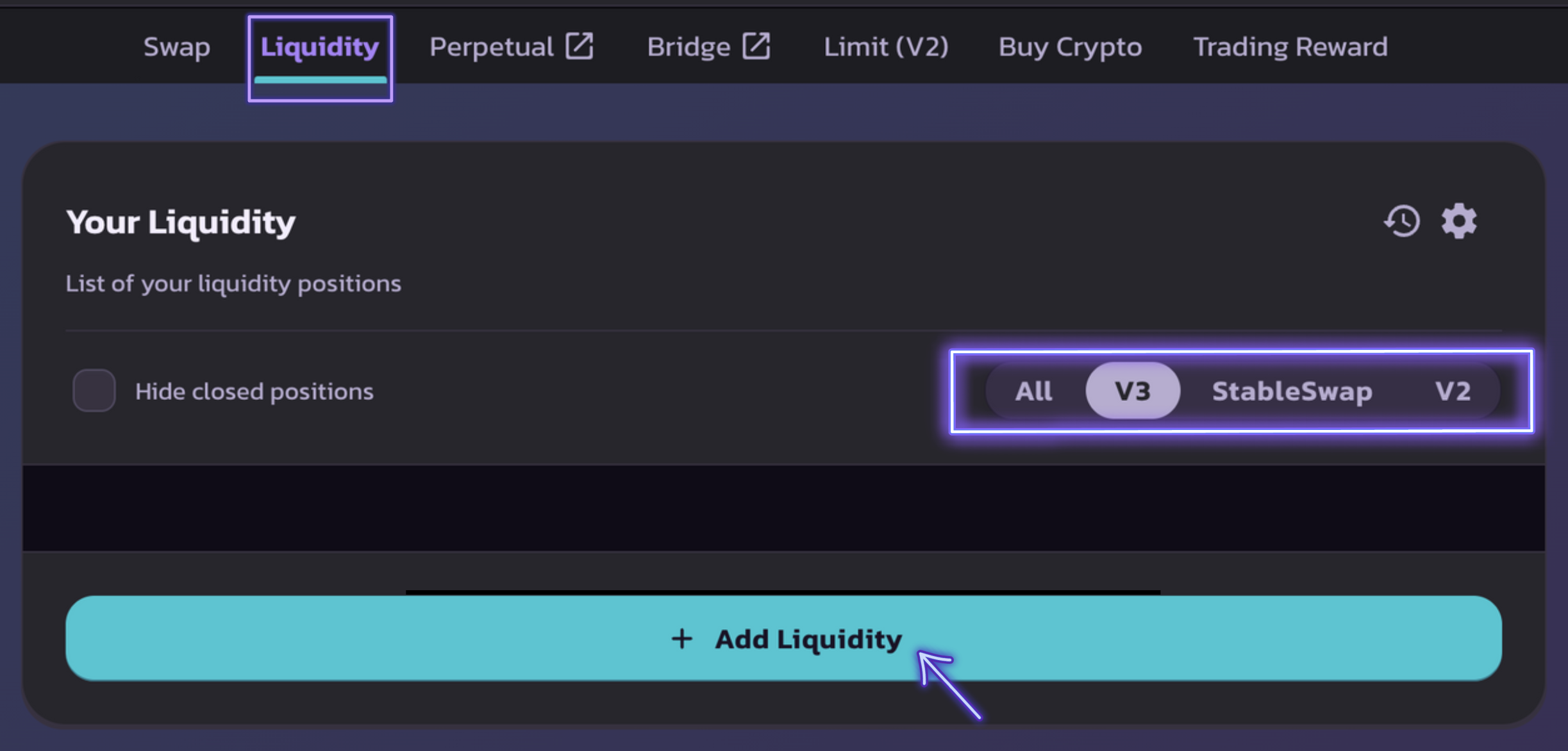 <figure><img src="https://content.gitbook.com/content/Ri5DcH6q4DB7nf3eOQBS/blobs/WPY3GqcRqF5qpOhj3nNa/Screenshot%202024-01-08%20at%2010.45.36%20AM.png" alt=""><figcaption><p>Selecione a opção "Liquidity", selecione V3 (ou outro) e pressione "Add Liquidity"</p></figcaption></figure>