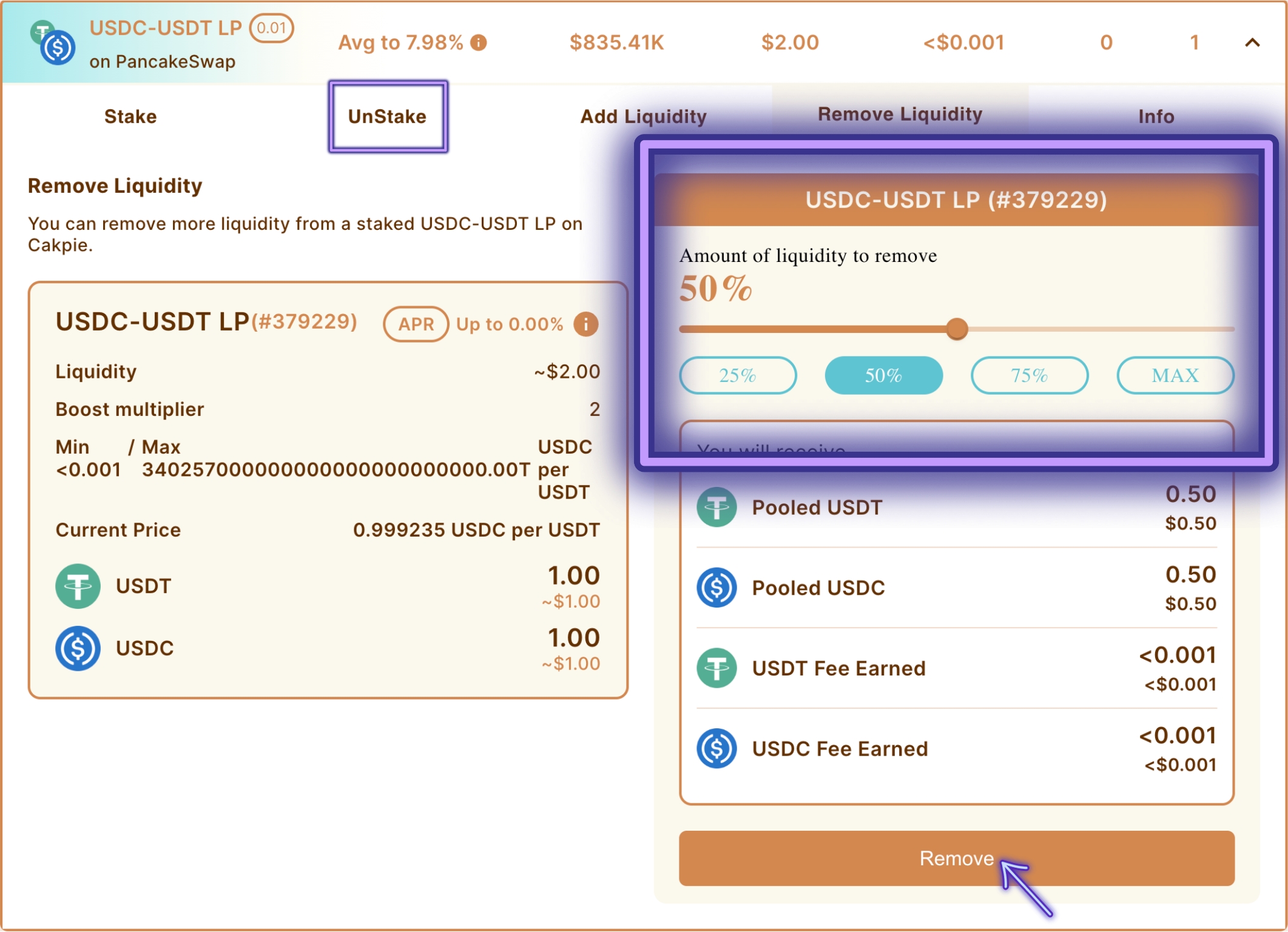 8. Usuários podem selecionar para desfazer o stake de sua liquidez da Cakepie