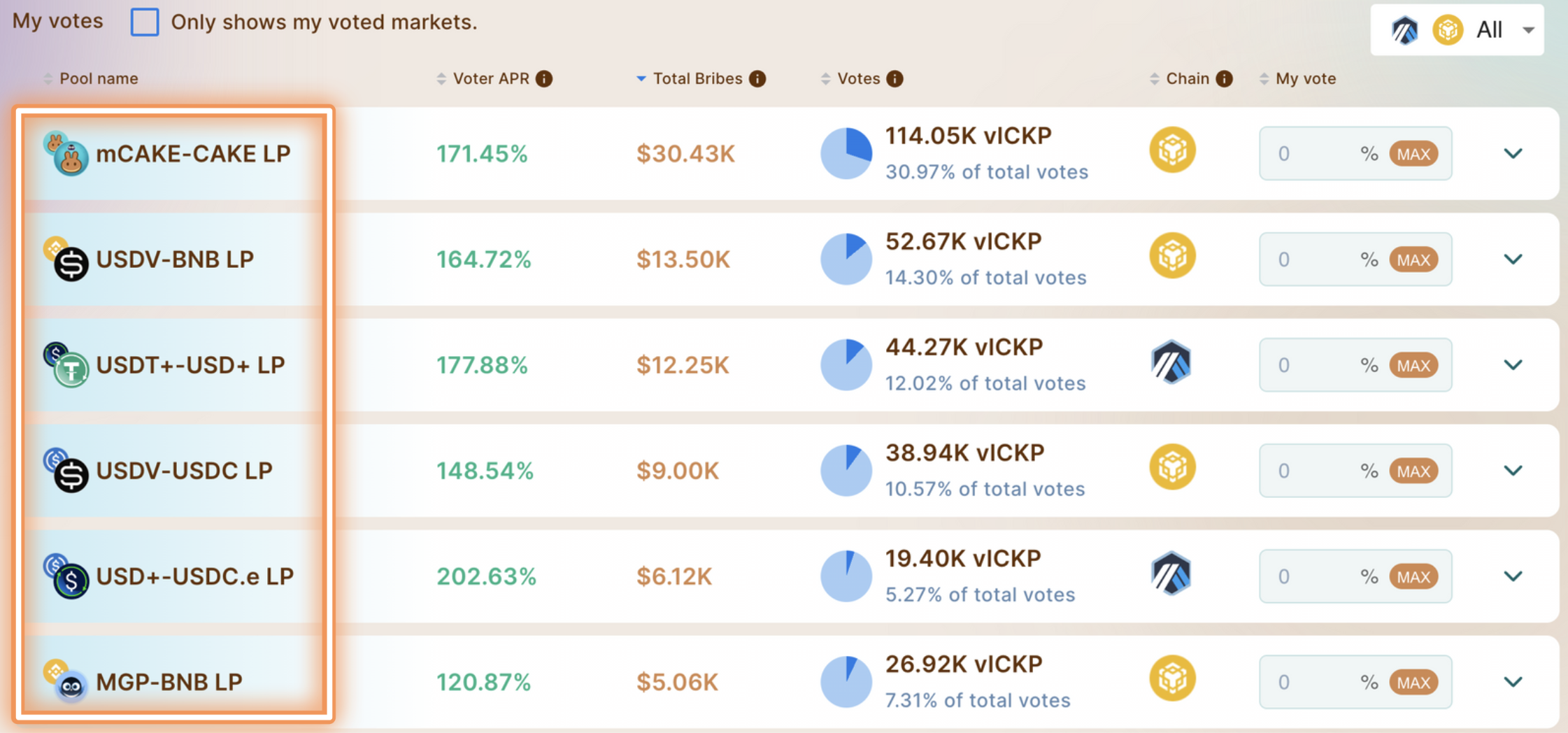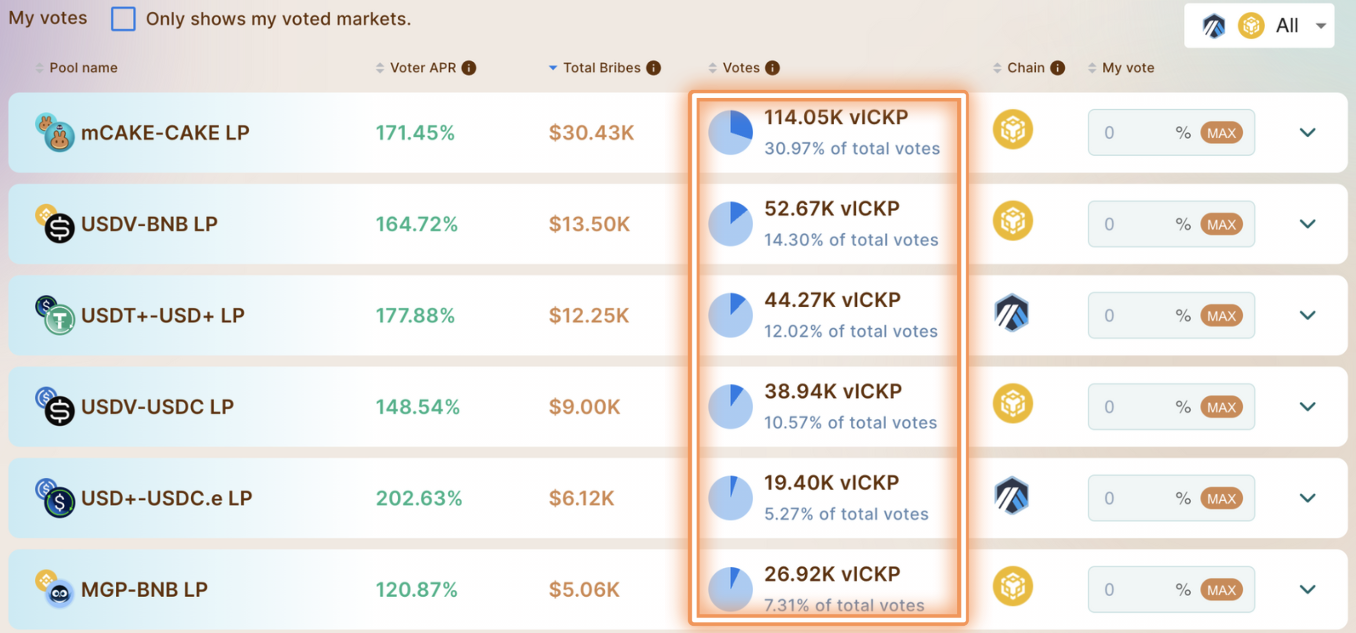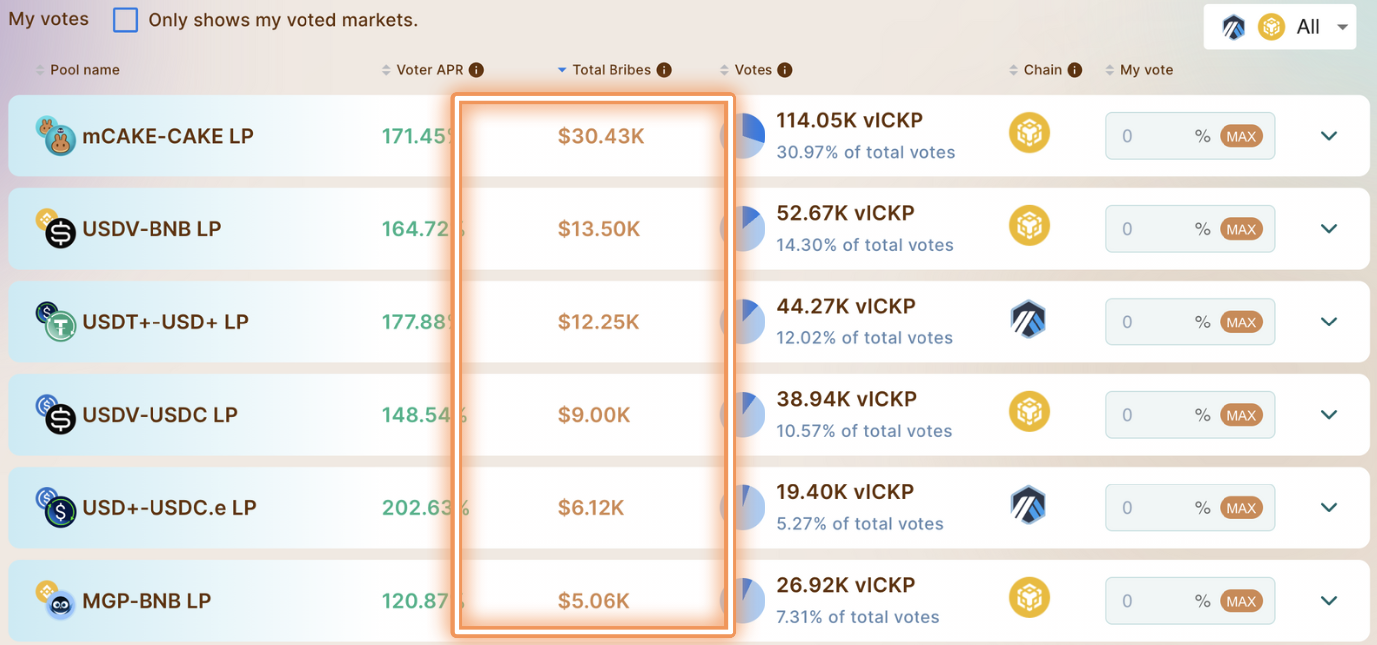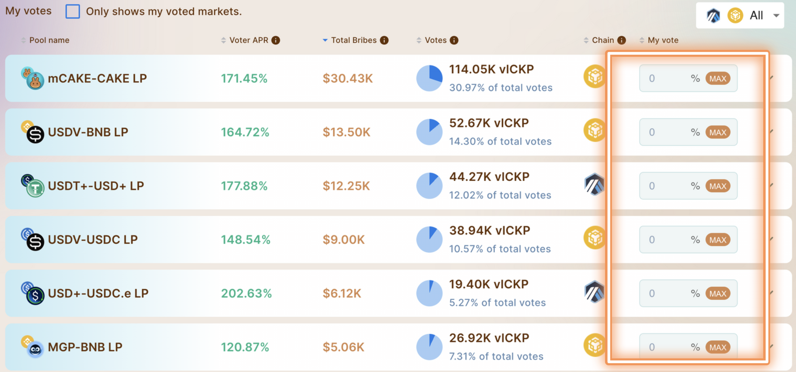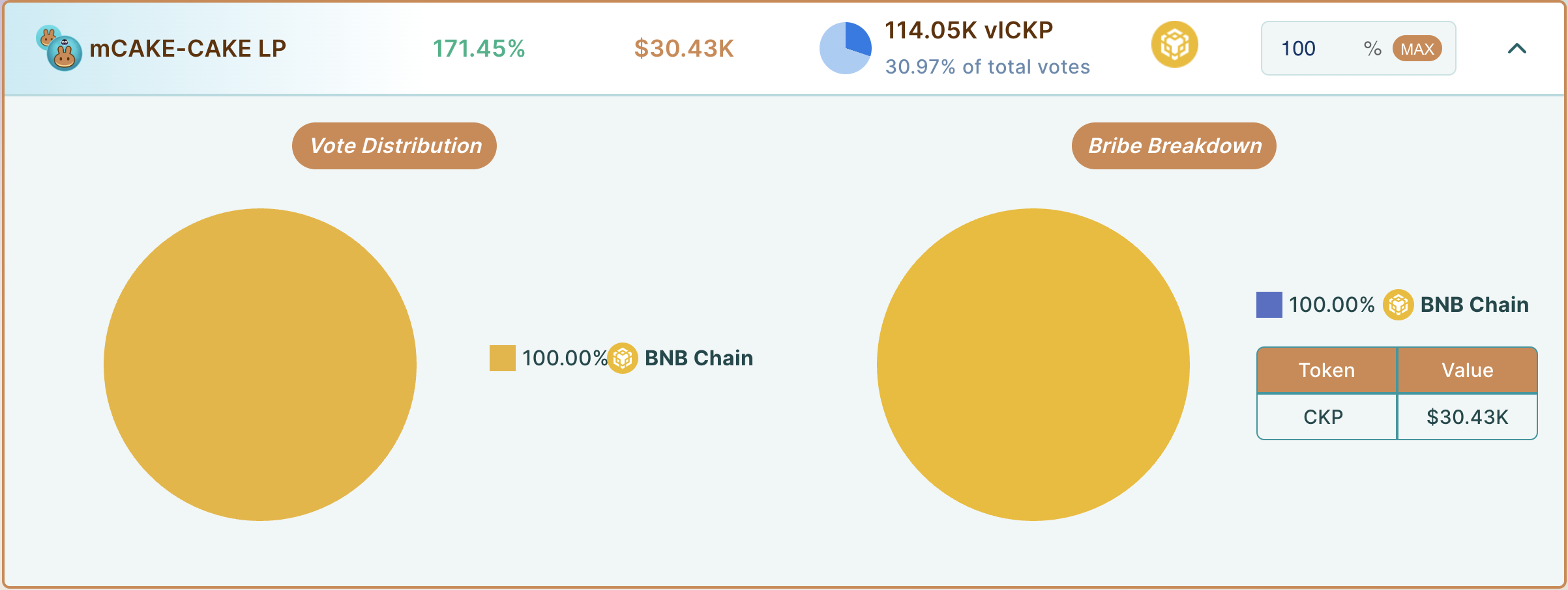 <figure><img src="https://content.gitbook.com/content/Ri5DcH6q4DB7nf3eOQBS/blobs/M9iocrq4RZRaLBfd22nu/Screenshot%202024-01-13%20at%206.03.14%20PM.png" alt=""><figcaption><p>Verifique qual token está sendo oferecido como suborno por cada par e em qual rede está sendo oferecido. Os usuários podem pressionar MAX para alocar 100% de seu vlCKP para uma pool específico</p></figcaption></figure>