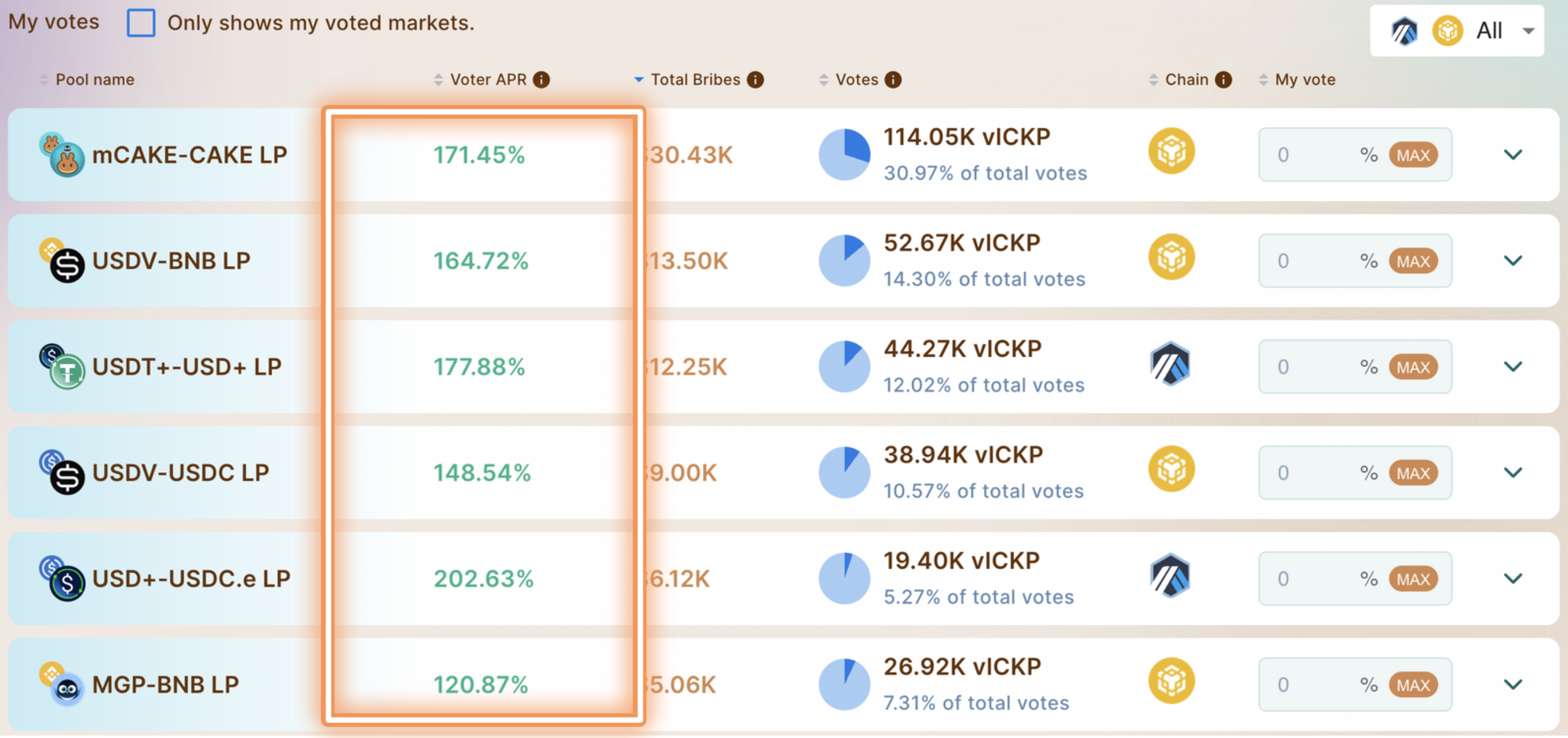 ### 5. Verifique a APR dos subornos que você pode obter votando em pares diferentes
