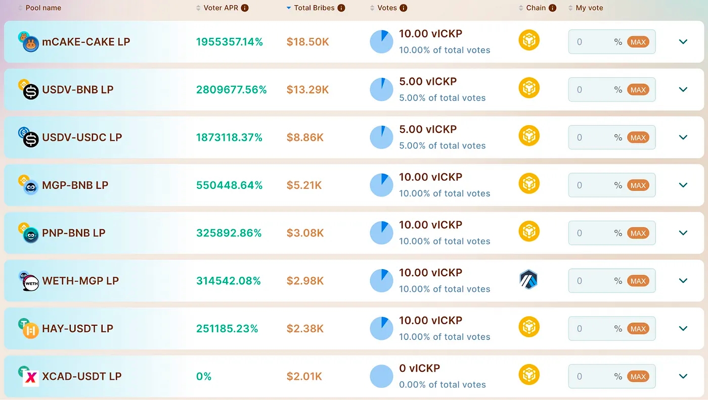 Os holders de vlCKP têm a capacidade de direcionar facilmente seu poder de voto para sua pool preferida, um recurso que agiliza sua participação no processo de distribuição de recompensas da PancakeSwap. Esta abordagem inovadora simplifica a atribuição de recompensas de CAKE e faz isso com um período de bloqueio consideravelmente mais curto do que o modelo de veCAKE. Além disso, concede aos usuários a flexibilidade de distribuir seus votos entre vários grupos simultaneamente, garantindo uma experiência de votação mais versátil e eficaz. Ao votar via Cakepie, os usuários podem monetizar facilmente seu poder de voto.