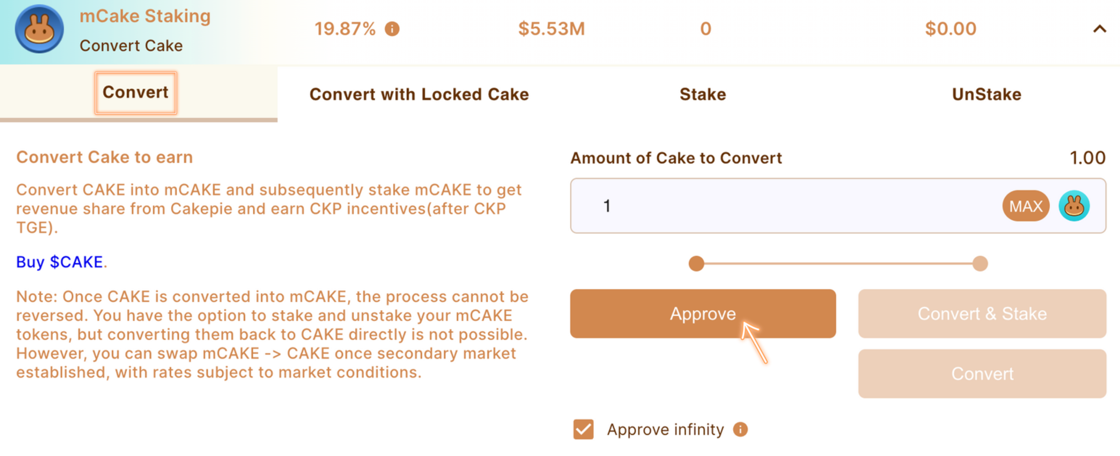 4. Approve the conversion from CAKE into mCAKE