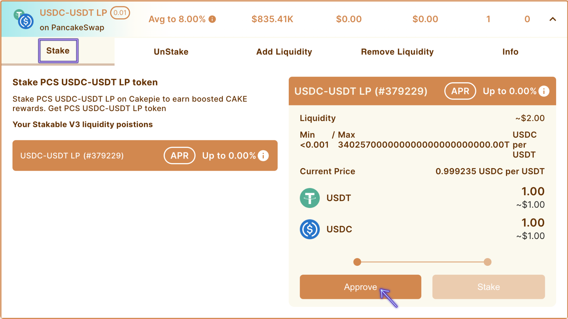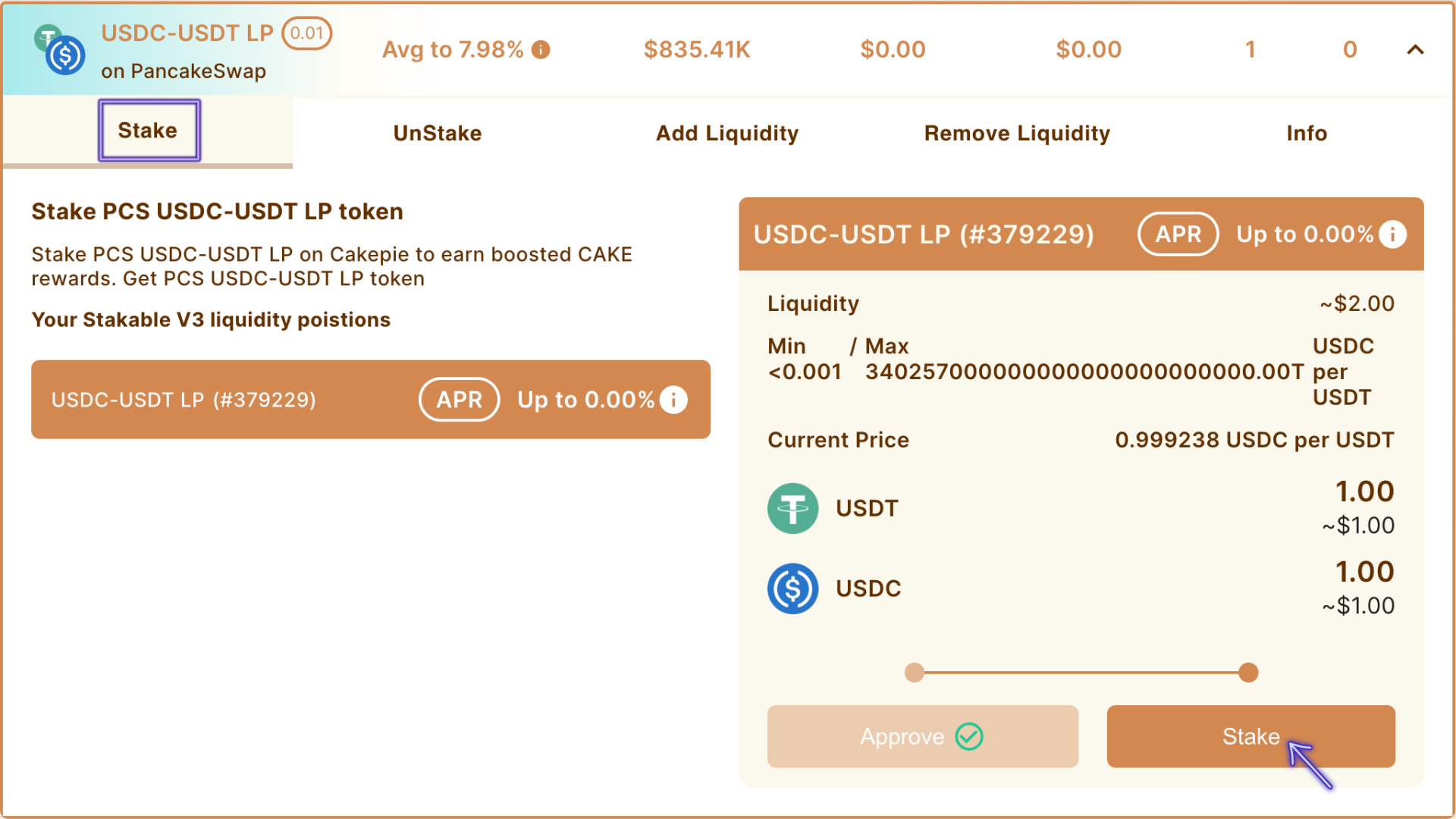 After completing the steps above, users can proceed to stake their liquidity on Cakepie.