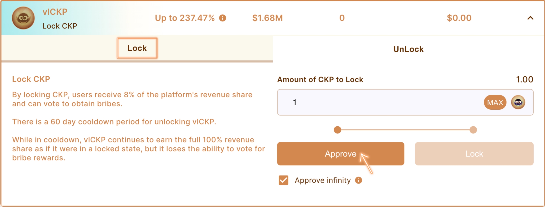 Approve (Approve infinity can be selected in case that users want to lock more CKP later)