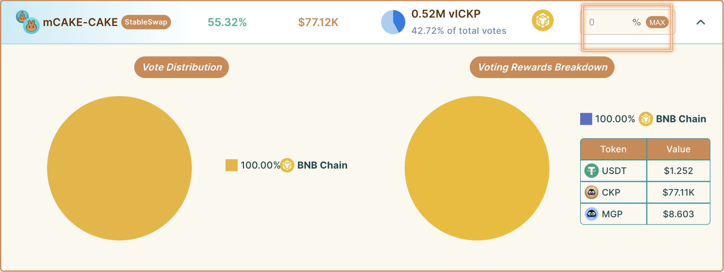 <figure><img src="https://407444007-files.gitbook.io/~/files/v0/b/gitbook-x-prod.appspot.com/o/spaces%2F1XrtBsoNQSWbsBVSDBhB%2Fuploads%2F2YDUYtGYe2uIxw6BzCtQ%2FScreenshot%202024-05-07%20at%202.25.42%20PM.png?alt=media&#x26;token=b4b416b3-eac3-4dba-bd65-d10fd92b016c" alt=""><figcaption><p>Upon selecting a pair to vote for, you can specify the percentage of your vlCKP that you wish to allocate to each pair. Users can press MAX to allocate 100% of their vlCKP to a specific pool</p></figcaption></figure>