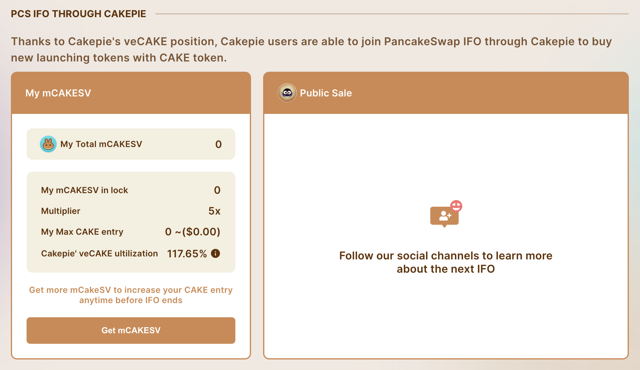 The IFO access is shared between mCAKE Stability Vault participants from Cakepie. When PancakeSwap hosts an IFO, mCAKE SV participants will be able to contribute CAKE tokens via Cakepie’s IFO page.